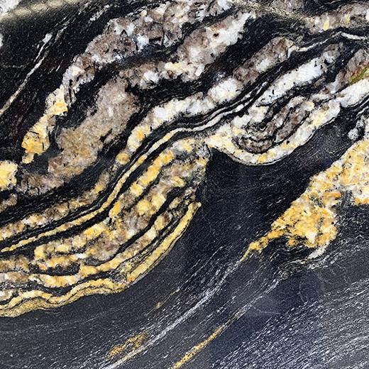 Granit noir veiné doré du Brésil, pierre de luxe rare, dalle de granit pour comptoirs de cuisine, îlot ou table.